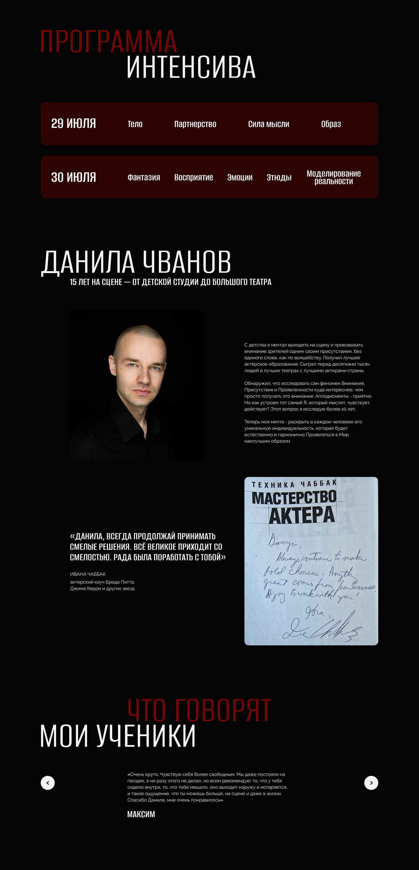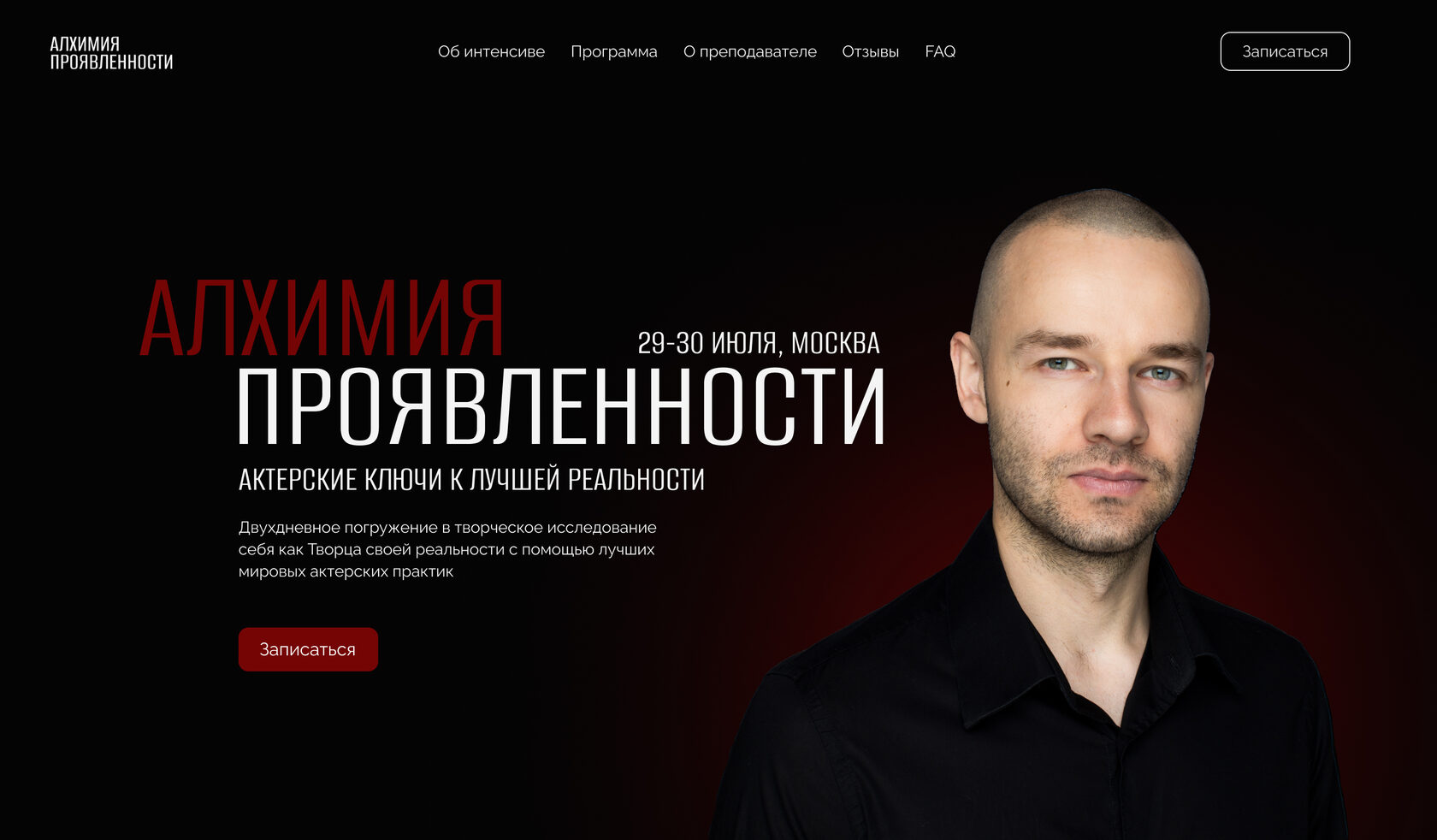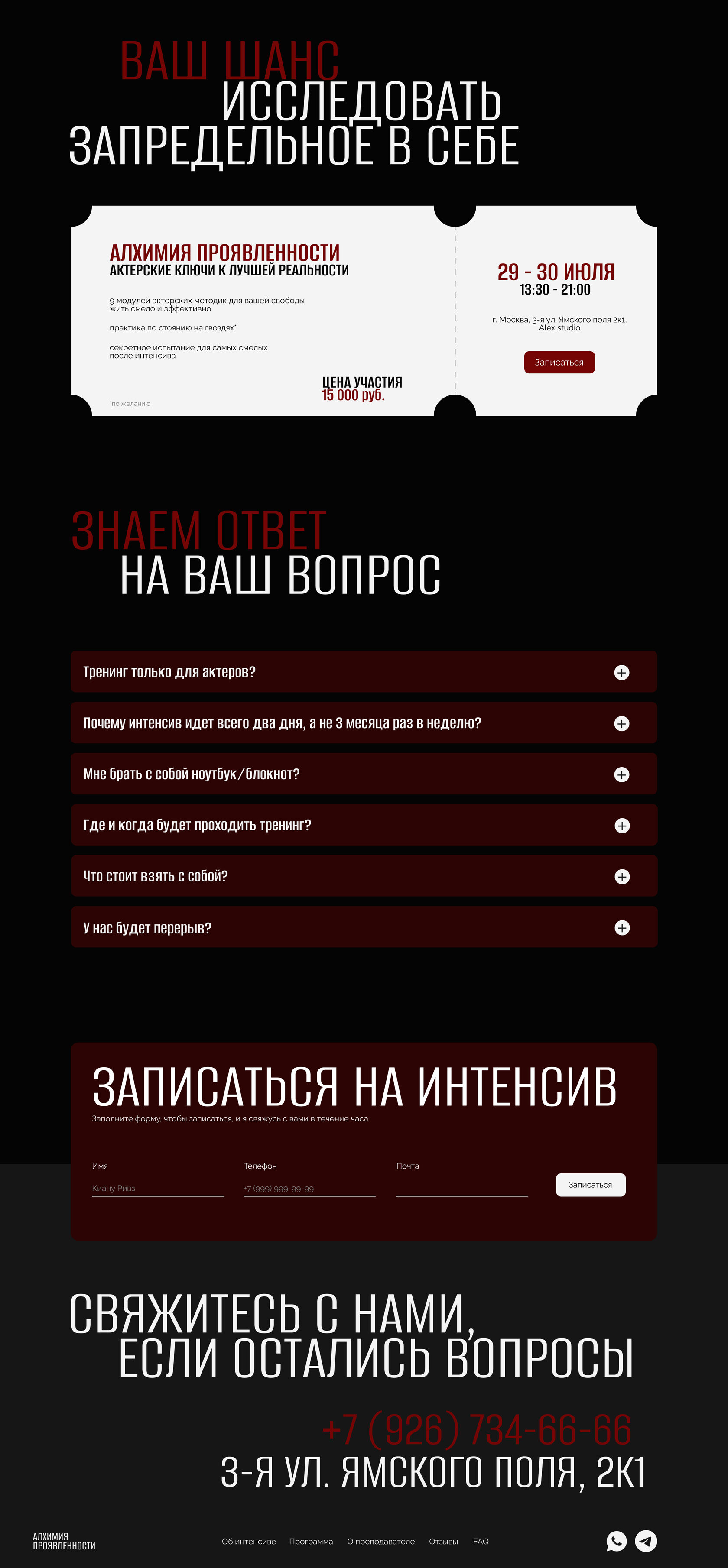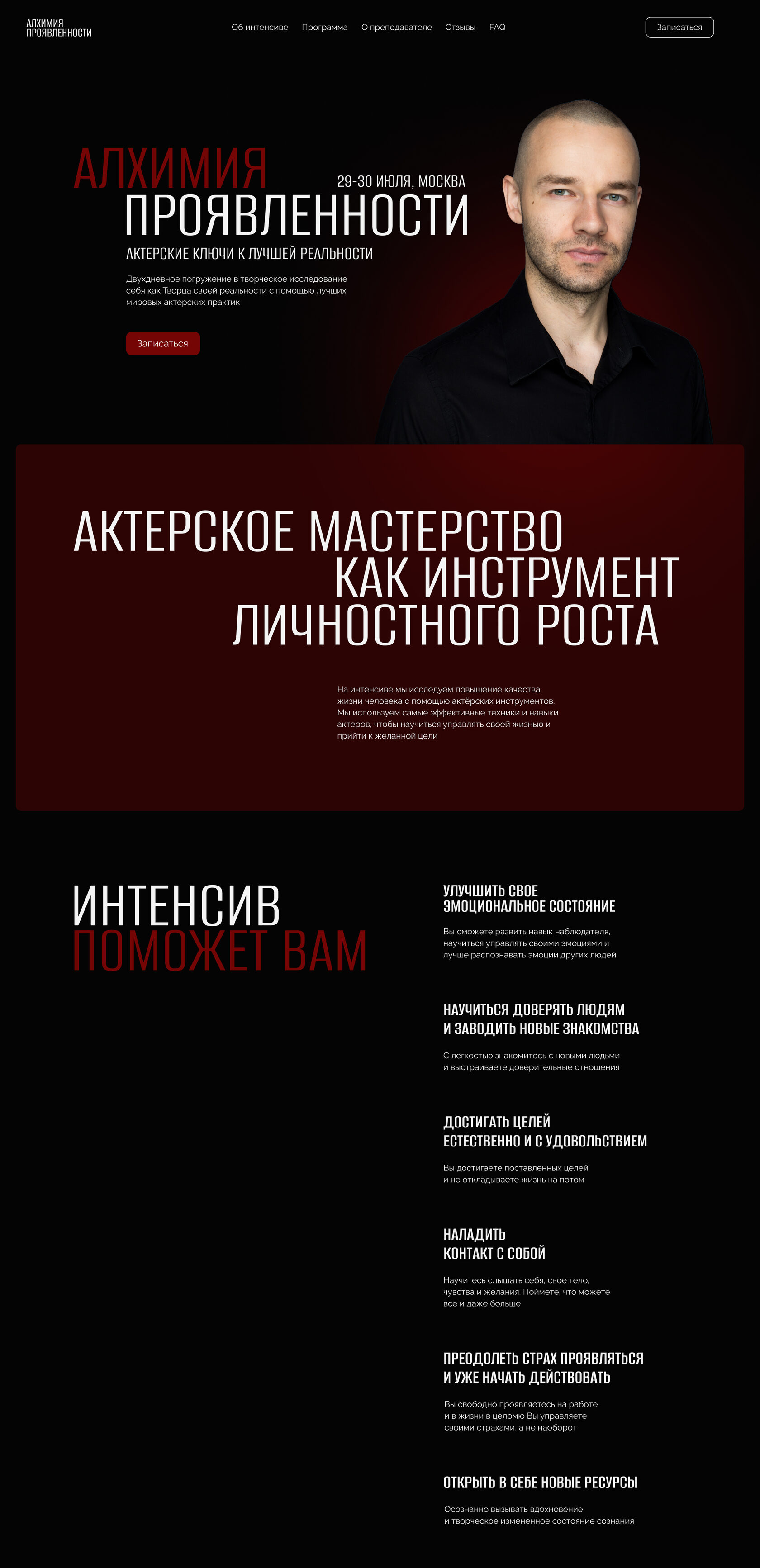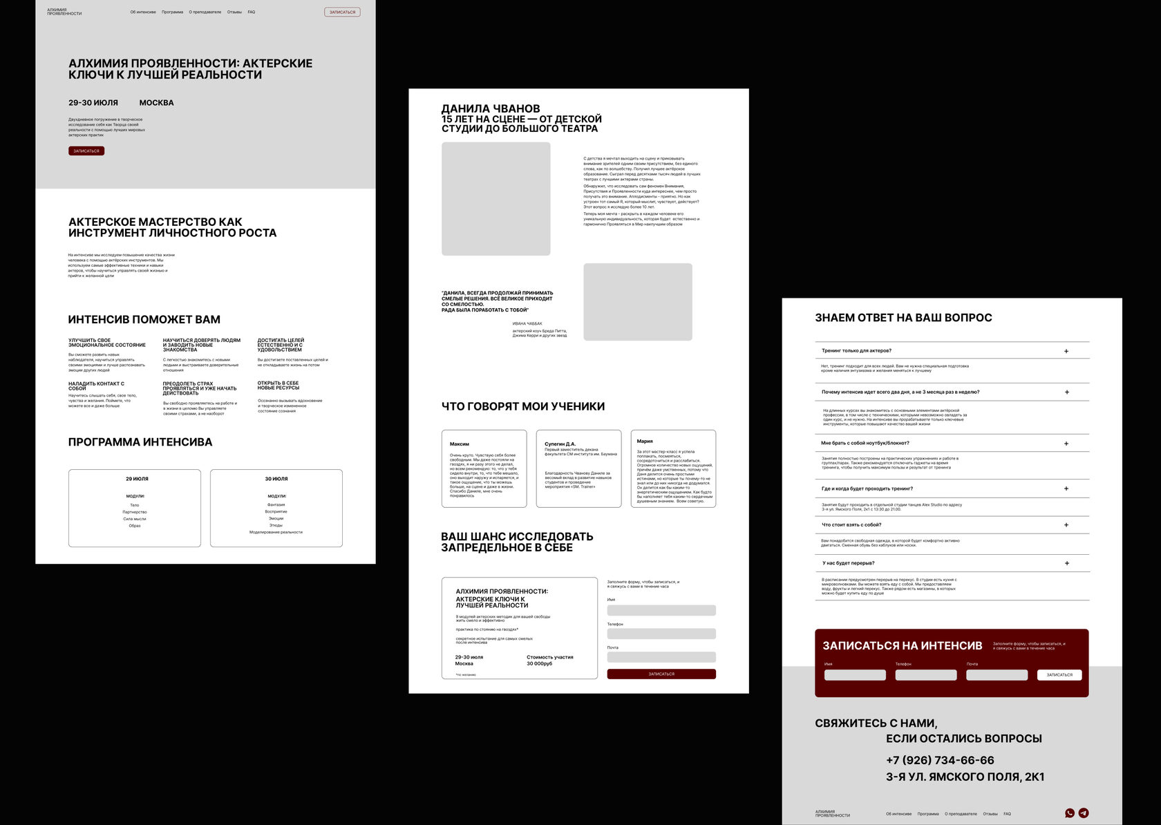 Since the site was planned for a single product, a landing page was sufficient. This page focuses on the course and the instructor, with an option to sign up. In addition to acting skills, the customer was also interested in personal growth and esotericism, which needed to be reflected in the site’s content